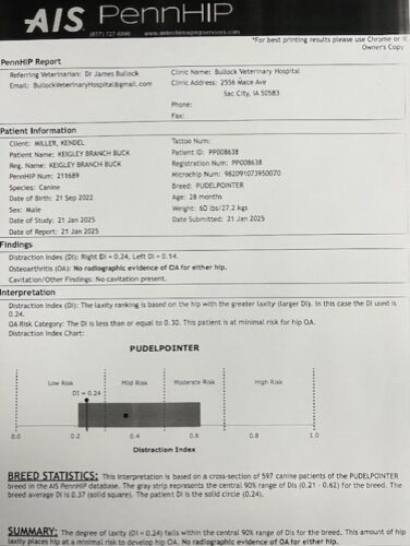 Huck consistently passes on natural ability, cooperation, endurance, and temperament, making him an excellent stud prospect for breeders focused on both NAVHDA testing and in the field hunting.