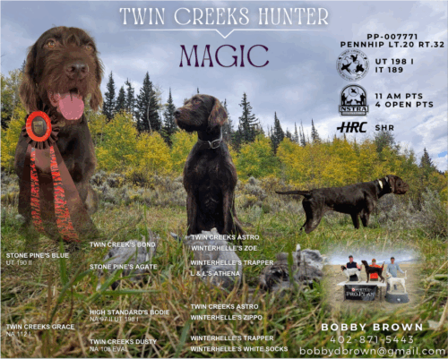 Twin Creeks Hunter: Magic is the culmination of years of work by Bodo and his Winterhels lines. He very much has that "It" factor that is hard to describe he is an incredibly intelligent animal. He is very easy to train in fact one of the fastest maturing males, I have had the pleasure to be around. He has been successful in every venue and as a wild bird hunter.
